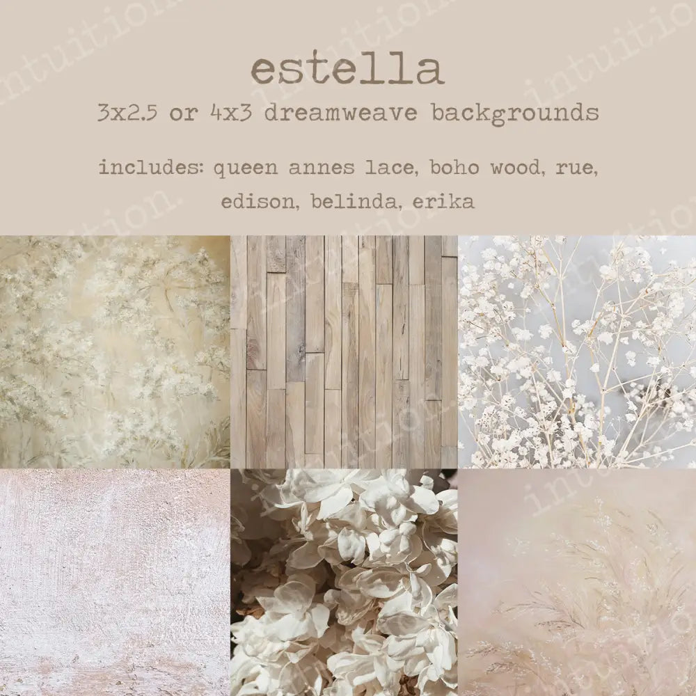 estalla includes: queen annes lace, boho wood, rue, edison, belinda & erika.